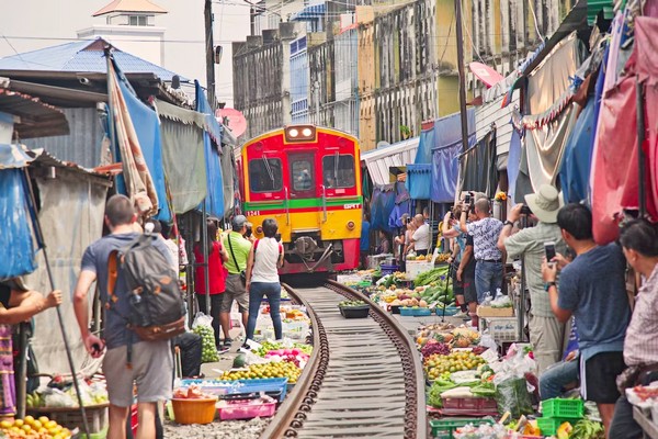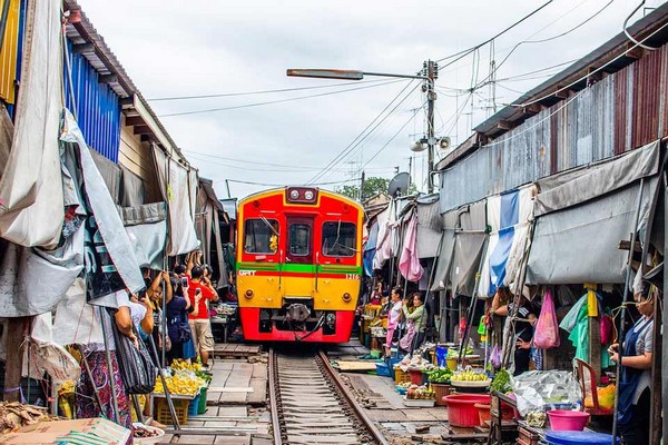 位於距曼谷65公里處的安啪哇府,市集活躍在鐵路兩旁,鐵皮屋遮陽棚櫛比鱗次疊床架黑壓壓擠滿兩旁,每家都將自己的攤位擺在鐵軌旁,攤販么五喝六交易密集,當火車通過時必有響鐘聲,就會看到店家們一一將自己攤位往後挪,火車僅擦著棚架駛過,隨著火車離去,攤位又陸陸續續的歸位,當地人對於這景像早已練就好一番好功夫,處變不驚、從容不迫是當地人心情最佳寫照,這可是在全世界唯一可以看到的特殊景觀。(註:火車到站參考時間:08:30、11:10、14:30、17:40)