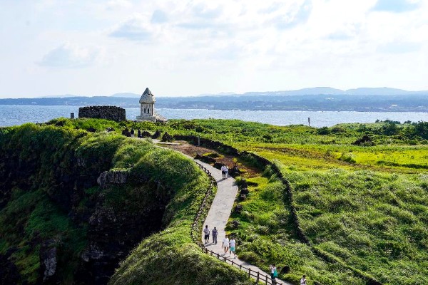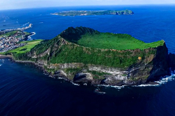 【城山日出峰】為漢拏山360個止火焰山之一,也是世界最大的突出於海岸的火山口,攀登30分鐘左右到達山頂;由此也可觀看日落,加上可以瞭望一片廣闊的牧場,美不勝收,令人嘆為觀止,遠眺這山峰綺麗景色。
