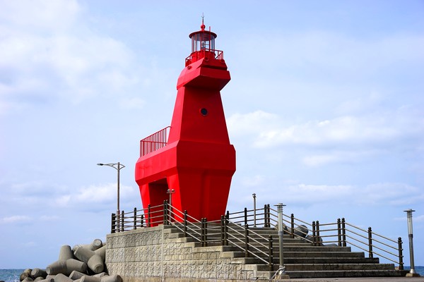 【梨湖紅白馬燈塔+彩虹海岸道路】濟州特有種「濟州馬」-特徵是矮小腿短,沒錯!這個燈塔就是參考濟州馬的造型,矮矮肥肥、萌萌貌。因為造型特殊,左邊一紅色、右邊一白,配上濟州的潔淨大海和藍天白雲更是成為IG打卡熱門景點,吸引許多旅客前來拍照合影留念。