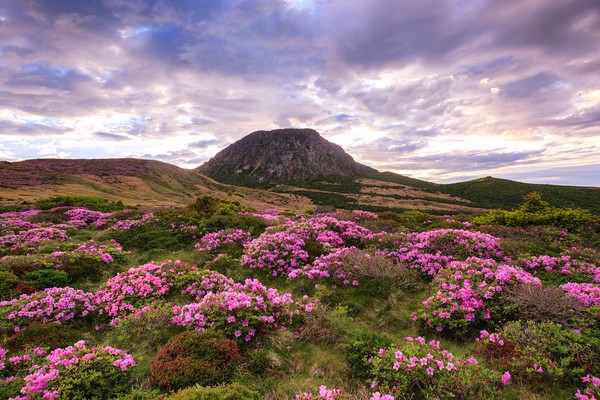 【漢拏山國家公園】漢拏山巍然聳立於濟州島中央,海拔高1950公尺,是濟州島最具代表性的名山,以「雲漢可拏引也」(山高到可以抓住銀河)而得名「漢拏山」,又因自古傳說有神仙在此居住,被稱為「瀛州山」(傳說中的東海仙山),與金剛山、智異山並稱為韓國的三神山。春季花海、夏季綠林溪流,到秋季滿山紅葉、冬季浩瀚雪原,全年都有好景色。