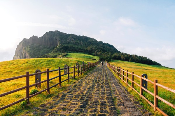 【城山日出峰】為漢拏山360 個止火焰山之一,也是世界最大的突出於海岸的火山口,攀登30分鐘左右到達山頂;由此也可觀看日落,加上可以瞭望一片廣闊的牧場,美不勝收,令人嘆為觀止,遠眺這山峰綺麗景色。