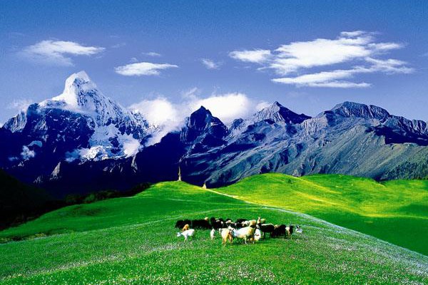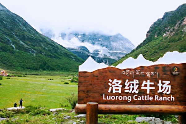 【洛絨牛場】洛絨牛場被“日松貢布”三座神山環繞,貢嘎河從草場穿梭,林間溪流潺潺,與牧場木屋交相輝映,構成了一幅原始而又迷人的景色,令人們進入返樸歸真的境界。成群的牛羊在這裡享受著充足的陽光,青青的草地和純淨的湖水,草長鷹飛,風吹草低現犛牛。