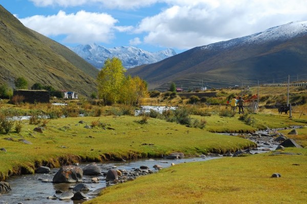 【桑堆小鎮】沿途欣賞獨特的藏族民居建築,在公路沿線的牧場開闊平展 ,河流平緩如鏡。遙望遠處在桑堆鎮起伏的山巒間散落著村落、牧人、牛羊,呈現一派寧靜祥和的景象。