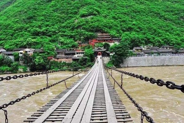 【瀘定鐵橋】為橫跨大渡河的鐵索懸橋,始建於清康熙四十四年,康熙曾禦書“瀘定橋”三字匾額掛於橋頭,至今橋東仍然立有康熙《禦制瀘定橋》碑。橋面全長 100 米,橋面距水位 14.5 米,由 13 根鐵鍊組成,是四川內地通 往康巴藏區的重要通道。