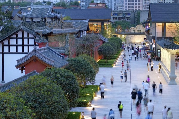 【太古里步行街】成都的時尚地標之一,鄰近春熙路,背靠大慈寺,集結購物、美食、休閒娛樂为一體的大型購物商街,這裡的結構設計與台中麗寶購物中心接近,但兩者差異除了太古里延續古建築重整,腹地更大,延伸到地下空間與成都地鐵相結合,是多樣貌的購物聖地。