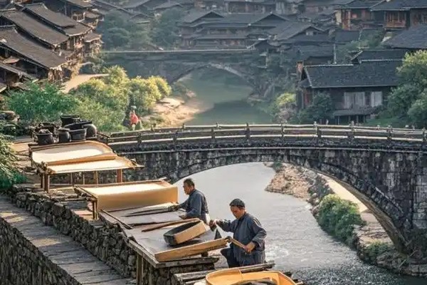 【石橋造紙村+非遺花草紙製作體驗】造紙術是中國的四大發明之一,具有幾千年的悠久歷史。在大山深處的丹寨石橋村苗寨,至今仍保留着一種以構樹皮為原料的古法造紙術。據苗族的口述歷史,石橋古法造紙與蔡倫紙物出同源,當地人供奉蔡倫為神仙。這種造紙術與《天工開物》中所記載的造紙圖解流程幾乎一模一樣,有不少專家認為石橋村古法造紙術與漢唐時期的使用的造紙術基本一致。