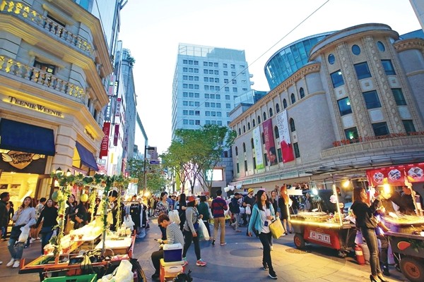 明洞是讓人聯想起一座巨大購物城的地方,一般來說明洞主街是指地鐵4號線明洞站到乙支路、樂天百貨公司之間大約1公里長的街道。此處擁有各式各樣的品牌專賣店、百貨公司、商店等,就如其流行聖地之稱,販售各種服飾、鞋子、飾品等。附近有樂天與新世界百貨公司,主街上則有Noon Square、明洞美利來(Migliore)、M Plaza等購物中心,各大品牌商店則聚集在主街及周邊巷弄內。除了購物以外,這裡也有眾多美食,從家庭餐廳、速食店、韓國料理、西洋料理到日本料理應有盡有。