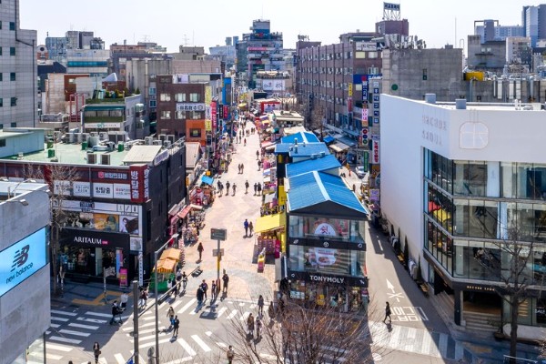弘大是年輕人的聚集地,時尚服飾店、化妝品店、生活家居店、書店、文具店、選品店、特色咖啡廳、美食餐廳林立,使弘大街頭變得更自由奔放而風格獨具。而無時無刻都有街頭表演或舞蹈表演的「漫步街道」,使這裡處處洋溢著青春活力。造訪此處,讓人不自覺地購物或忙著欣賞特別的店家,腳步不知不覺地變得輕快起來。而在弘益大學正門前的弘大兒童公園,每週六都會舉辦藝術市集自由市場,週日則有希望市場。許多風格獨具的藝術家會到此販售自己的作品。