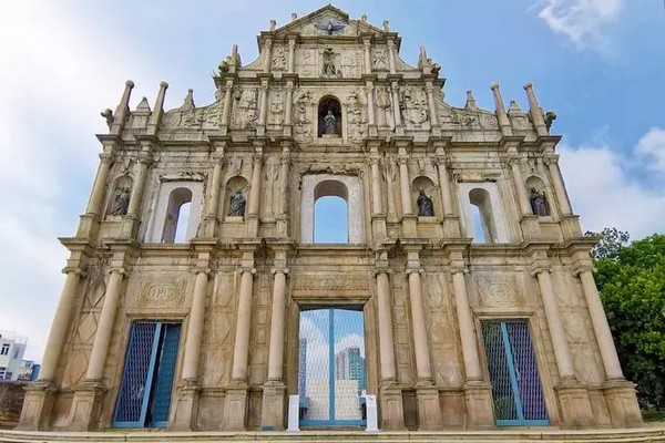 【大三巴牌坊】澳門最著名的名勝,為聖保祿教堂的前壁遺跡,教堂原本是一名義大利籍的耶穌會神父設計,由日本工匠以鬼斧神工的技術協助建成。1602年奠基,1637年全部竣工,而教堂前一段長石階則於稍後完成。這間教堂與火結下不解之緣,從其雛型起始,至現時僅存的前壁牌坊,先後經歷三次大火,屢焚屢建,是一所活生生的歷史見證。