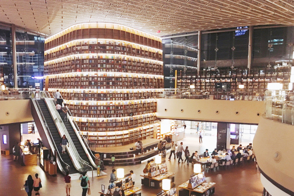 【COEX星空圖書館】圖書館位於江南COEXMALL裡,裡面有一面高三、四層樓的大書櫃,巨型的外觀抄級吸睛,成為星空圖書館的招牌!館內有5萬多本的書籍、600多本雜誌和電子書供大家免費觀看,但不可以帶走,裡面的座位很多很舒適寬敞。除此之外,館內還常常舉辦藝文活動及有鋼琴現場演奏。雖然看不懂韓文,也可以拍拍照,體驗當一下文青。