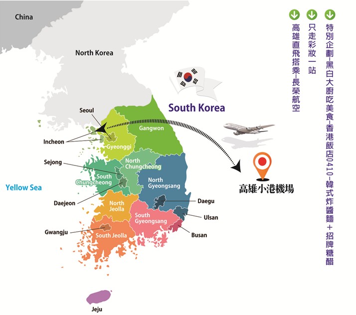 集合於【高雄】國際機場辦理登機手續,搭乘豪華客機飛往韓國【仁川永宗國際機場】韓國政府花了60億美金,總面積近50萬平方公里,耗費八年打造而成,2001年開幕後,廣受好評,瑞士日內瓦國際機場協會,連續兩年將仁川機場評為亞太最佳機場。