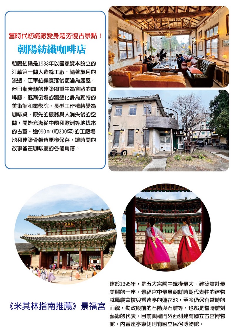 【朝陽紡織咖啡店】朝陽紡織是1933年以國家資本設立的江華第一間人造絲工廠,隨著歲月的流逝,江華紡織衰落後便淪為廢屋。但日漸衰頹的建築卻重生為寬敞的咖啡廳,逐漸倒塌的牆壁化身為獨特的美術館和電影院,長型工作檯轉變為咖啡桌,原先的機器與人消失後的空間,開始充滿從中國和歐洲等地找來的古董。保留著碎玻璃窗的英國製門扉、曾掛在捷克舊火車上的圓鏡、每逢冬天便努力翻身的鯛魚燒機器,都彷彿原本就在那個位置般自然地擺放著,讓時間的故事留在咖啡廳的各個角落。現在咖啡廳內販售各種飲料和蛋糕,吸引許多人前來感受這裡獨特的氛圍