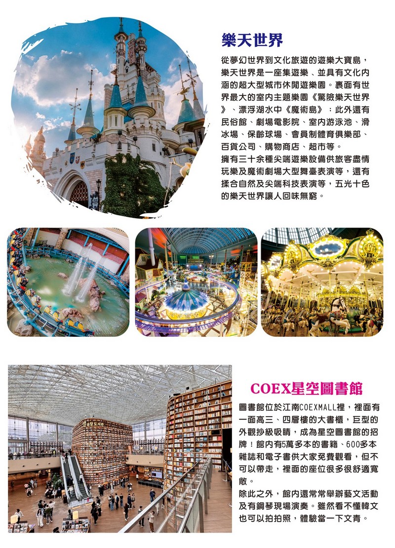 【LOTTE WORLD樂天世界】分為室內和室外,室外的『魔幻島』是屬比較刺激的遊樂設施,如100公尺高的高空降落、高空鞦韆、海盜船、亞特蘭蒂斯大冒險等,還可以在浪漫的湖水公園散步。室內的『探險世界』有旋轉木馬、世界單軌車、日內瓦遊覽船、各國風情的街道、各國料理餐廳、紀念品店,還可欣賞精彩的巡遊Show、吉祥物Show及鐳射Show。
