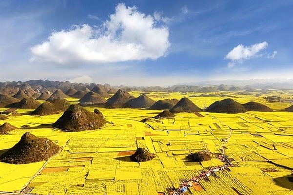 【金雞峰叢】來到羅平最知名的景點就在羅平的金雞峰叢,羅平金雞峰叢是中國四大峰叢之一,佔地有近百平方公里,峰叢是一種地形的名稱,因為有著特殊的喀斯特地形,許多錐狀山頭玲瓏有致的散落在這一片土地上,高的百餘公尺,低的十幾公尺,像是雨後春筍一般。由於這裡峰叢的面積非常的大,峰叢下種滿了滿滿的油菜花,當油菜花盛開的時候,這裡會有著無邊無際的金黃色海洋,氣象萬千,令人目不暇己。傍晚返回羅平市區。