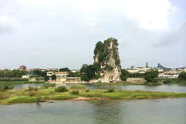 【伏波山】是一座依水傍水的孤峰,漢代時伏波將軍馬援南征曾經過此地,故得名。唐時山上曾建有伏波將軍廟。現有癸水亭、聽濤閣、半山亭、還珠洞、米芾自畫像、千佛岩等名勝,還有一口重1000餘公斤的“千人鍋”和重2700多公斤的大鐘。還珠洞內有一塊自洞頂垂懸而下的巨石,被稱為試劍石,距地面僅寸許,戛然而斷,相傳是伏波將軍試劍所致。伏波山在桂林市區東北的灕江邊上,在半山亭和山頂,登高眺望,可看到桂林清秀如畫的水光山色,因而有『伏波勝境』之美譽。