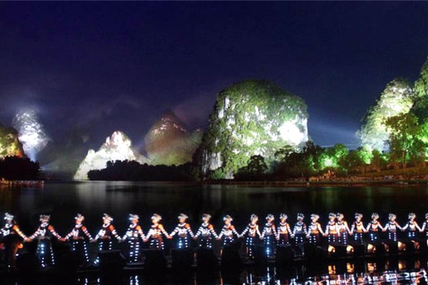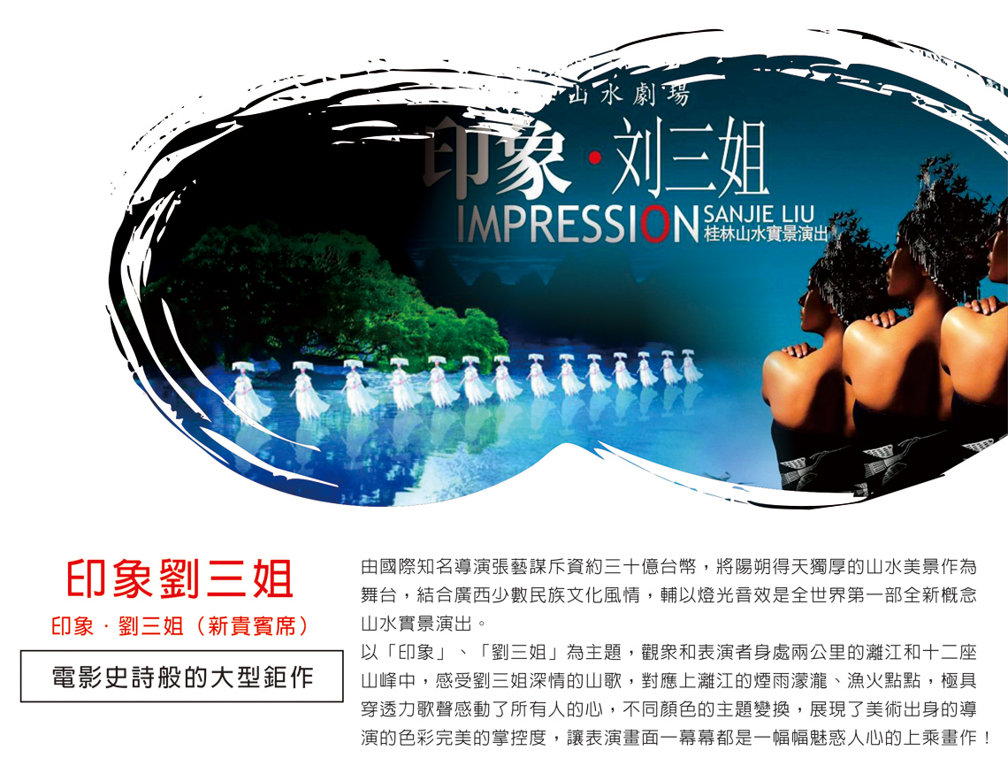 【印象.劉三姐(新貴賓席)】國內最大規模的環境藝術燈光工程及煙霧效果工程,大型實景演出,表演舞臺為兩公里的灕江水域及十二座背景山峰,構成全世界最大的天然劇場,其大寫意地將劉三姐的經典山歌、廣西少數民族風情、灕江漁火等到多元素創新組合,不著痕跡地溶入山水,還原於自然,並成功的詮釋了人與自然的和諧關係,創造出天人合一的境界,被譽為“與上帝合作之傑作”