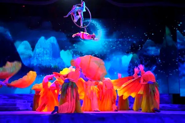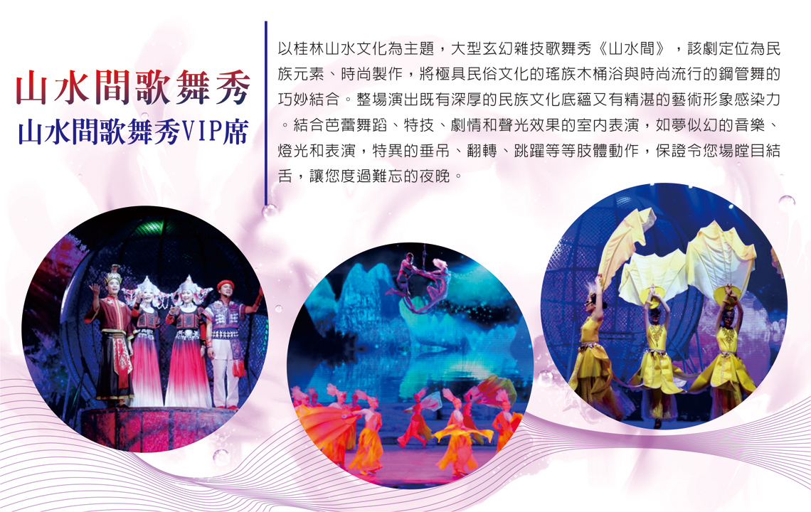【山水間歌舞秀VIP席】以桂林山水文化為主題,大型玄幻雜技歌舞秀《山水間》,該劇定位為民族元素、時尚製作,將極具民俗文化的瑤族木桶浴與時尚流行的鋼管舞的巧妙結合。整場演出既有深厚的民族文化底蘊又有精湛的藝術形象感染力。結合芭蕾舞蹈、特技、劇情和聲光效果的室內表演,如夢似幻的音樂、燈光和表演,特異的垂吊、翻轉、跳躍等等肢體動作,保證令您場瞠目結舌,讓您度過難忘的夜晚。