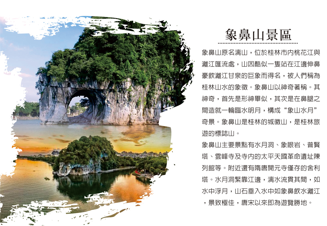 【象鼻山景區】屬於喀斯特地貌自然風景區,2017 年升為國家 AAAAA 級旅遊景區 。山因酷似一隻站在江邊伸鼻豪飲灕江甘泉的巨象而得名,被人們稱為桂林山水的象徵。