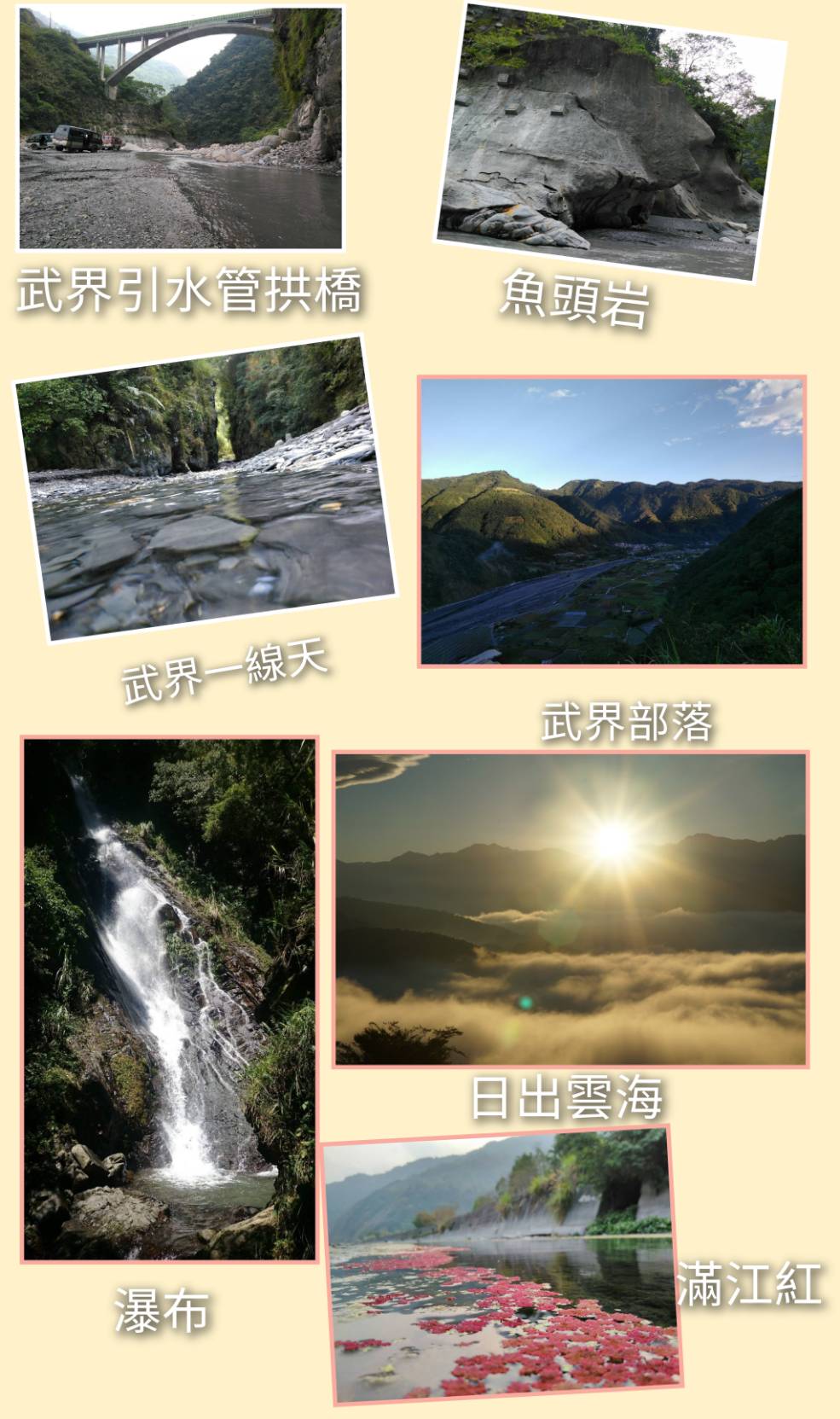 ---:--- 濁水溪、魚頭岩、撿龍紋石(又稱幸運石)、一線天、部落市集、武界水壩外庫、武界引水道