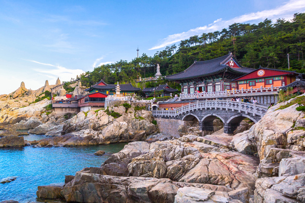 【海東龍宮寺】由高麗恭愍王的王師懶翁大師創建於1376年,原名普門寺,是韓國三大觀音聖地之一。因結合海、龍與觀音大佛,使這裡比其他地方有著更深層的信仰意義。傳說只要在海東龍宮寺真心誠意地祈禱,菩薩將會於夢中顯靈並實現一個願望。也是釜山唯一擁有無敵海景且最靠近海的寺廟。