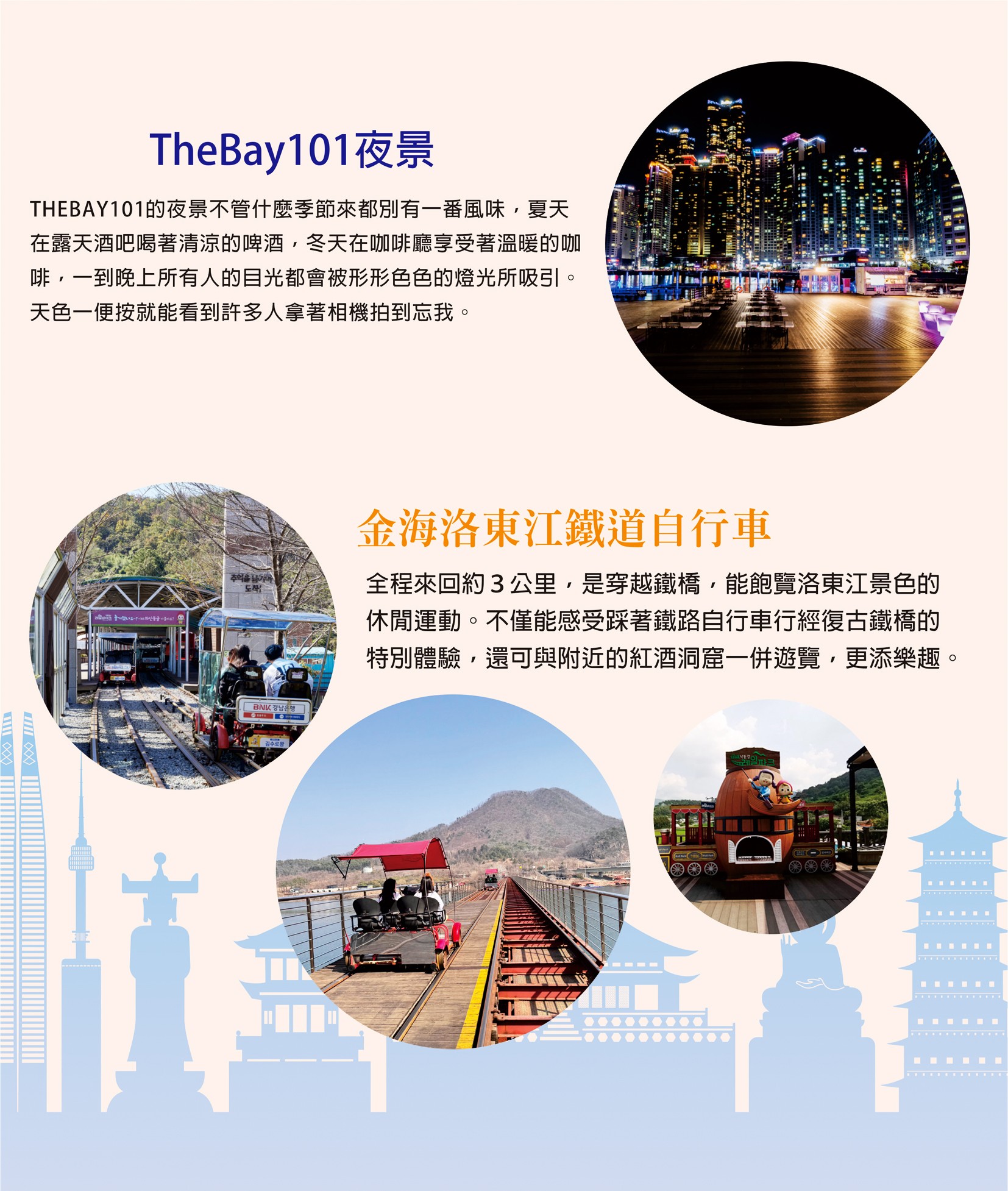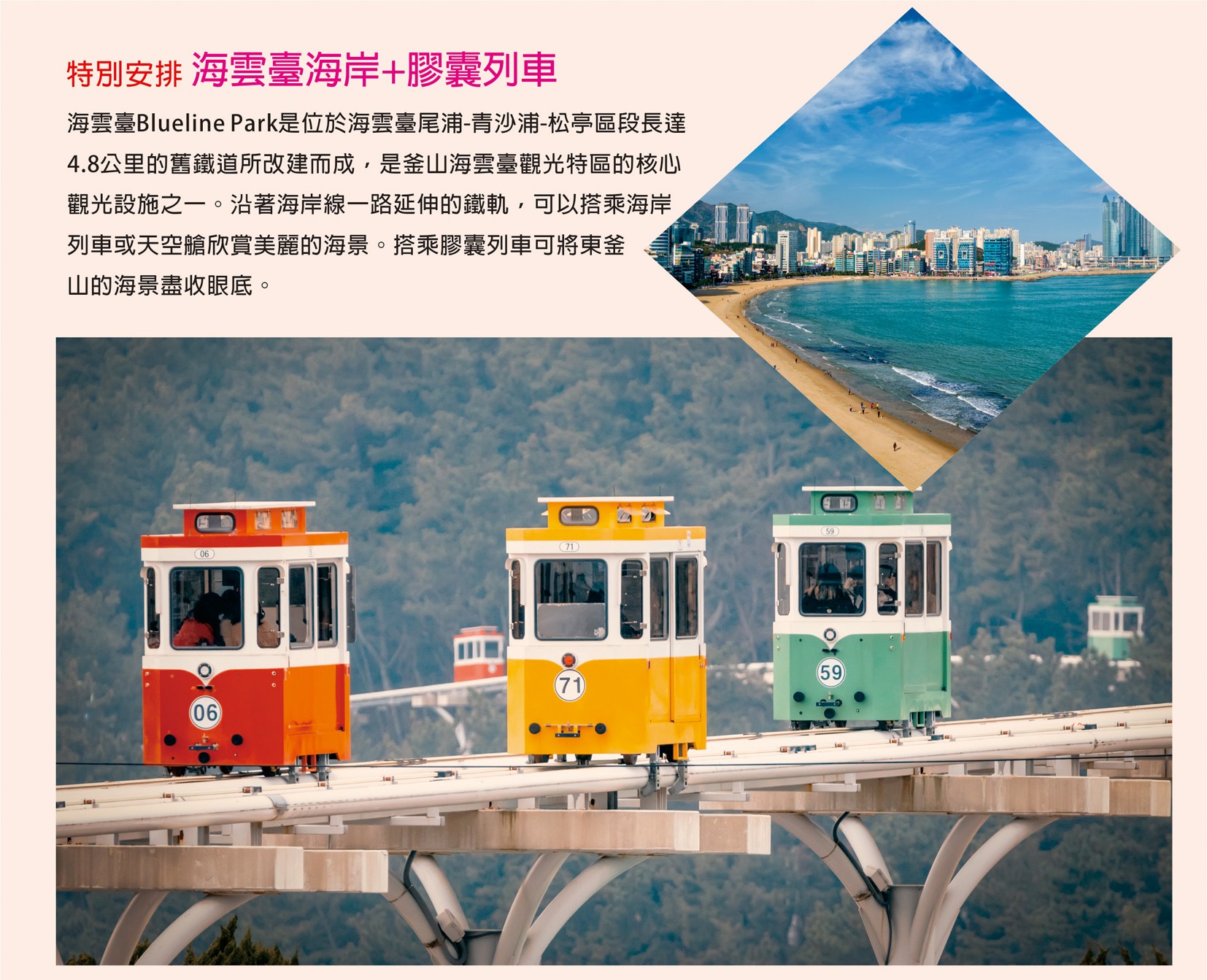【海雲臺海岸+膠囊列車海雲臺Blueline Park是位於海雲臺尾浦-青沙浦-松亭區段長達4.8公里的舊鐵道所改建而成,是釜山海雲臺觀光特區的核心觀光設施之一。沿著海岸線一路延伸的鐵軌,可以搭乘海岸列車或天空艙欣賞美麗的海景。搭乘膠囊列車可將東釜山的海景盡收眼底。