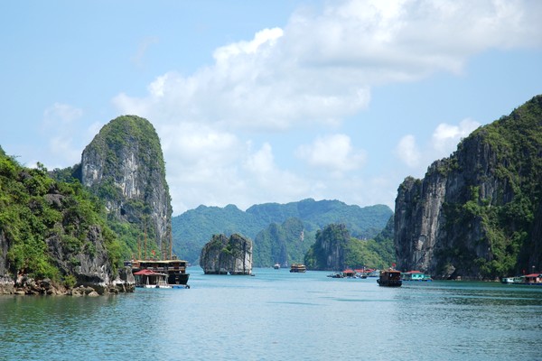【下龍灣遊船Ha Long Bay世界遺產】(註:船隻停靠碼頭,上下岸時請注意個人安全。)世界自然遺產之一的【下龍灣】。下龍意即「降下神龍」的意思,源自於地方的神話故事,傳說中玉皇大帝命令天上的神龍與其後代阻止海上的外來侵略,因此神龍便從嘴裡吐出翡翠,落至凡間變成變成令人驚奇的島嶼及喀斯特地形,其範圍非常廣泛,面積約有4000平方公里,其中散佈超過一千六百座石林及石筍狀的小島,這些小島亦有【龍島】、【猴島】、【龜島】、【蟾蜍島】、【鬥雞島】......等別名;海面上突起的奇形怪狀天然岩石雕刻,相當生動,乘船繞行其中,體驗大自然的鬼斧神工之妙。